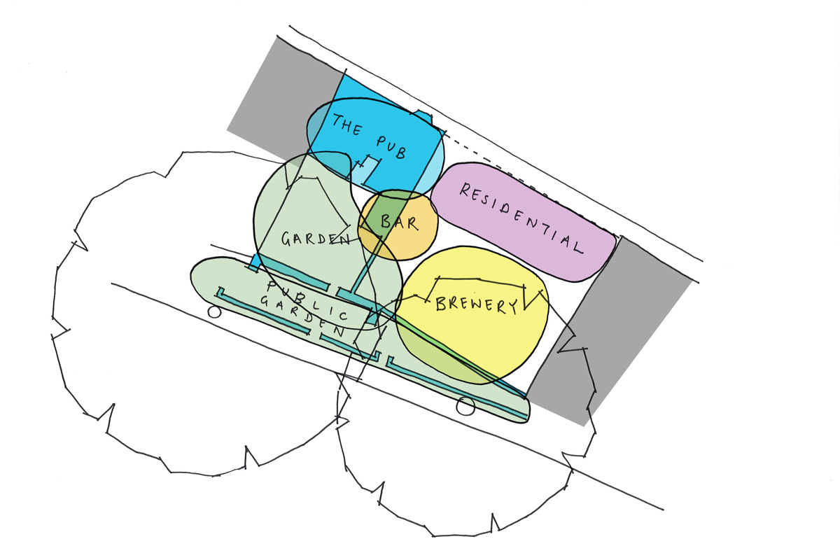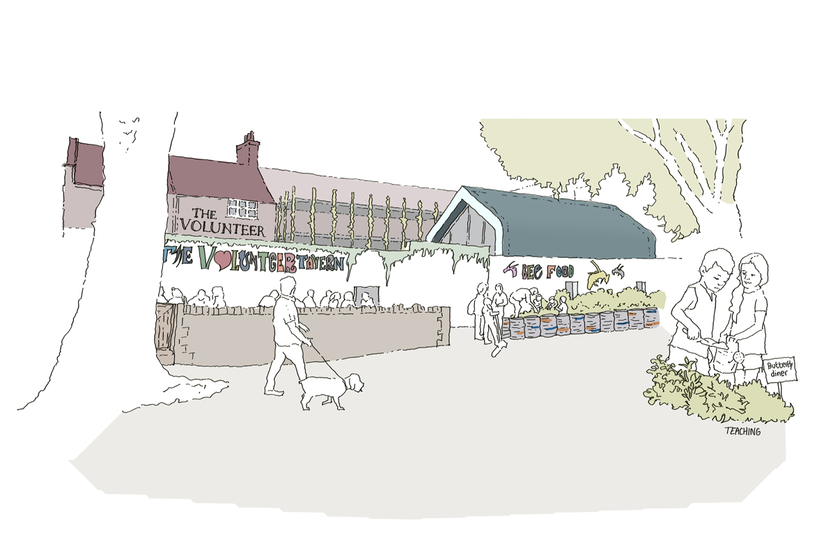 Our proposals for ‘The Volly’ saw the restoration of the listed pub; the introduction of a new brew-hall event space; an extension of the existing beer gardens; areas for growing produce and hops; and new affordable housing.